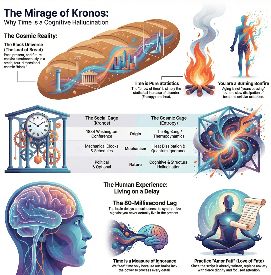 What if the future is not a possibility, but a territory that already exists? From Einstein's Block Universe to the heat of entropy, discover why time is merely the measure of our ignorance. Stop fighting the clock and recover your sight.